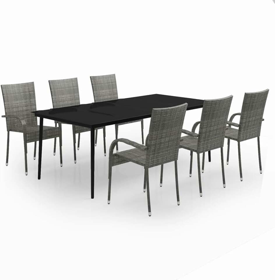 vidaXL 7-Piece Patio Dining Set - Outdoor Furniture Set with Glass Tabletop, Powder-Coated Steel Frames, Gray and Black, Modern Design