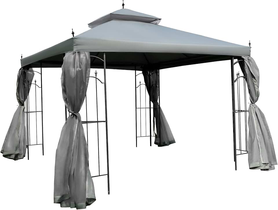 10' x 10' Patio Gazebo with Corner Frame Shelves, Double Roof Outdoor Gazebo Canopy Shelter with Netting, for Patio, Wedding, Catering & Events, Gray