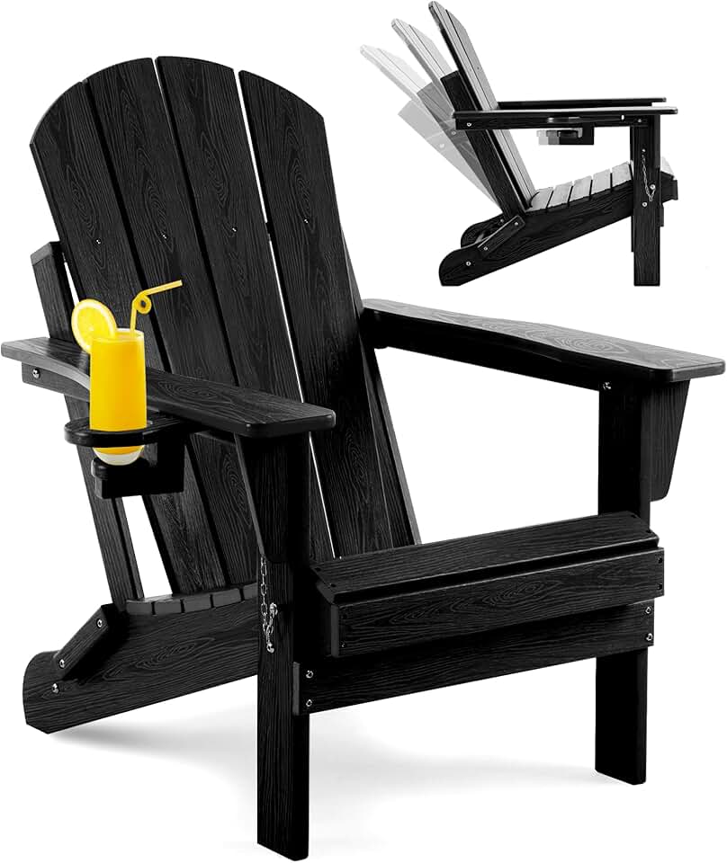 Adjustable Folding Adirondack Chair with Wood Texture, Weather Resistant HDPE Reclining Chair, Oversized Patio Chair with Cup Holder for Patio, Yard, Lawn, Garden, Deck (Black)