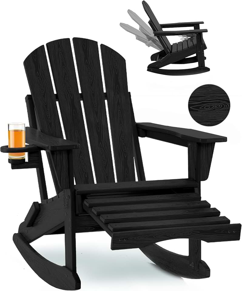 Adjustable Adirondack Rocking Chair with Retractable Ottoman, 4-in-1 Multifunctional Folding Patio Chair with Cup Holder, Outdoor Chair Wood Texture for Lawn, Porch, Backyard, Pool(Black)
