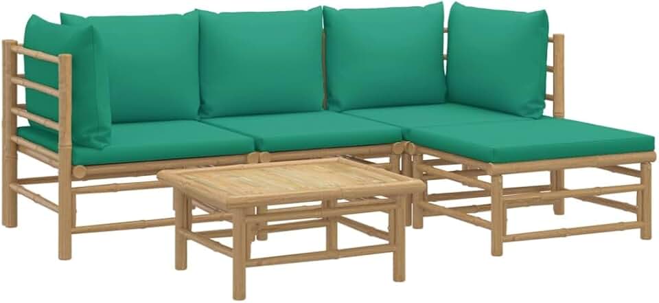 vidaXL 5 Piece Outdoor Bamboo Patio Lounge Set with Green Cushions - Natural Durable Material, Comfortable Seating, Practical Table, Modular Design