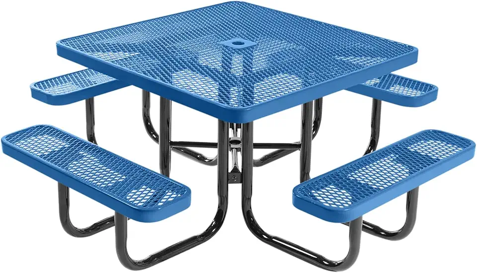 Coated Outdoor Furniture Heavy-Duty Portable Outdoor Picnic Table with Umbrella Hole, Expanded Metal Commercial-Grade Patio Dining Furniture Made in America (46" Square Top, Textured Light Blue)