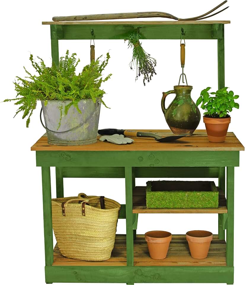 Rustic Gardening Workbench Outdoor Potting Table with Tool Hooks - Wooden Patio Furniture (Painted Greenhouse Frame)
