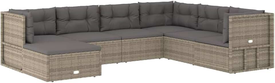7 Piece Outdoor Patio Lounge Set with Cushions - Gray Poly Rattan Furniture Set - Weather Resistant, Adjustable Seats, Powder-Coated Steel Frame, Modifiable Design