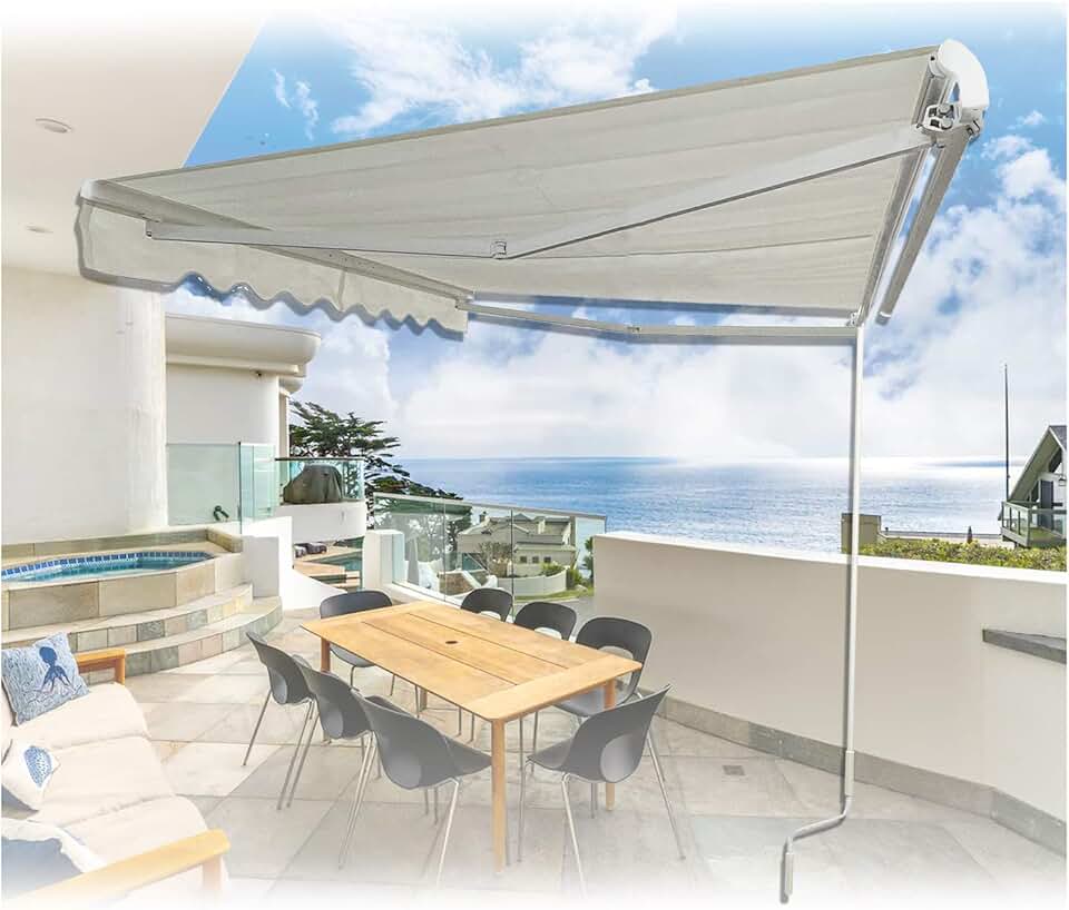 HongK- Retractable Awning (Manual) Aluminum Water-Resistant Polyester 12'×10' Patio Sun Shade with Handle Crank Pole for Outdoor Home Motorhome RV Restaurants Travel Camper [P/N: SF-HT12X10-IVORY]