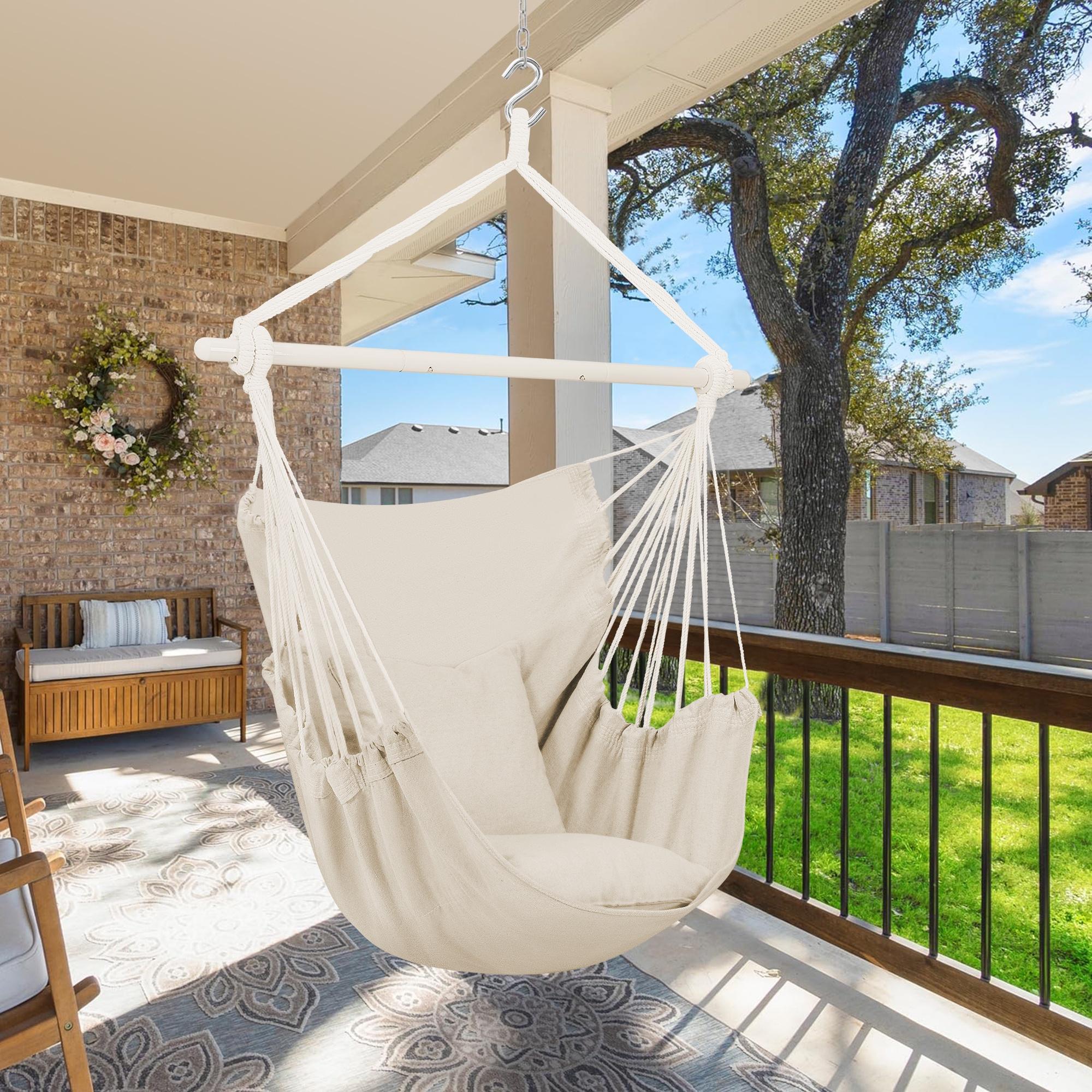 Large Hammock Chair Swing, Relax Hanging Rope Swing Chair with Detachable Metal Support Bar & Two Seat Cushions, Cotton Hammock Chair Swing Seat for Yard Bedroom Patio Porch Indoor Outdoor