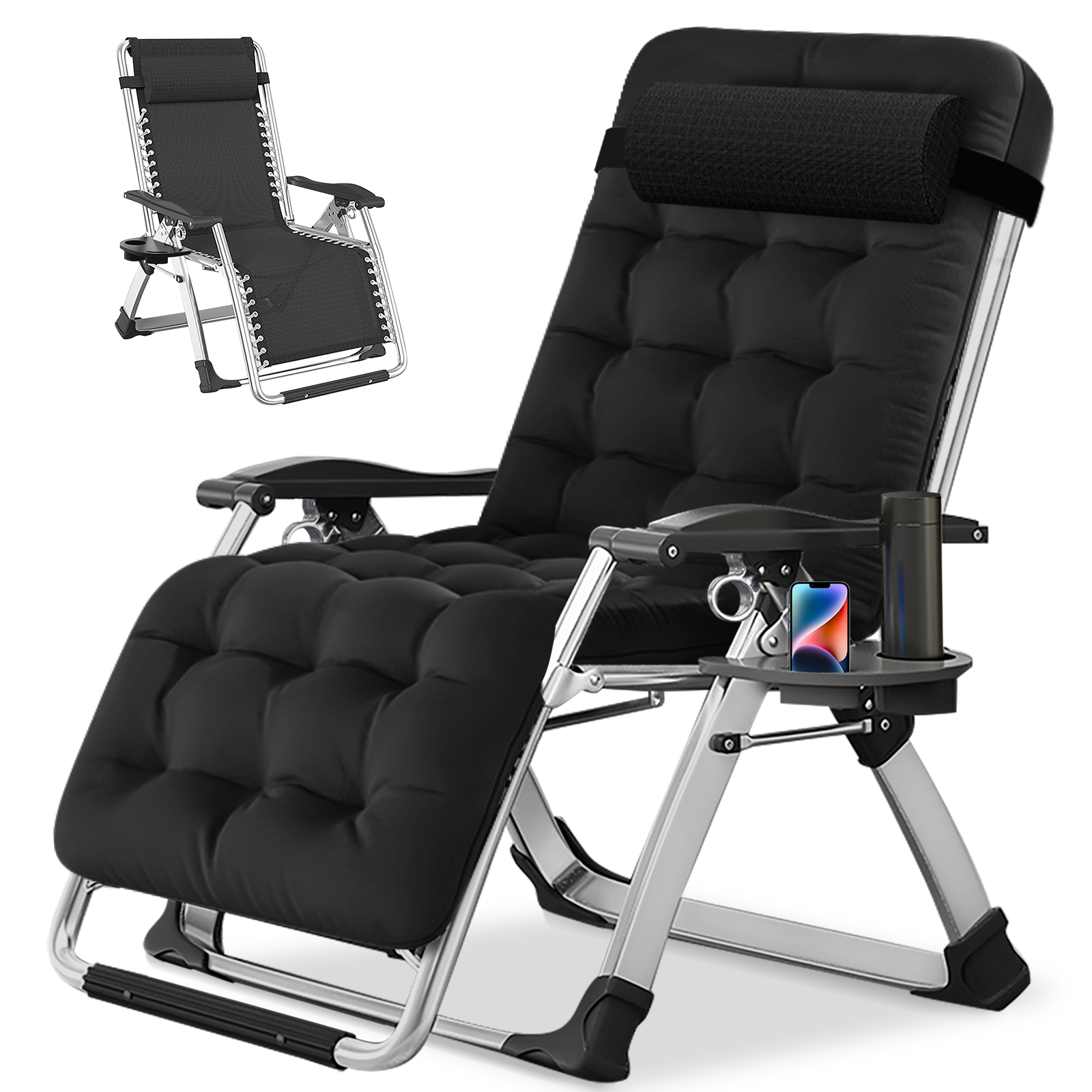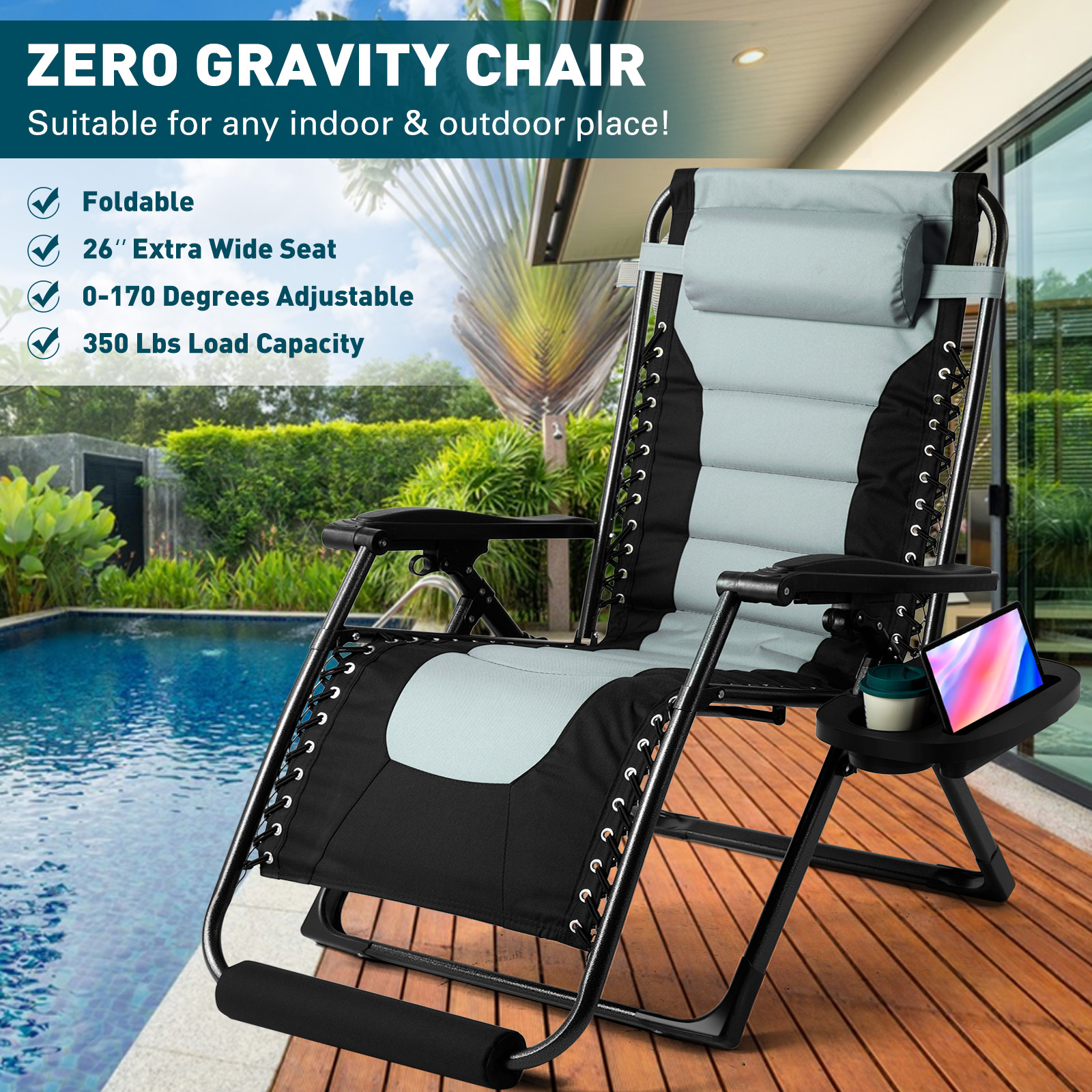 27.95" Zero Gravity Chair, Oversized Adjustable Recliner Patio Lounger 350 lbs with Steel Mesh, Removable Pillows, Cup Holder, Foot Pad (Black+Gray)