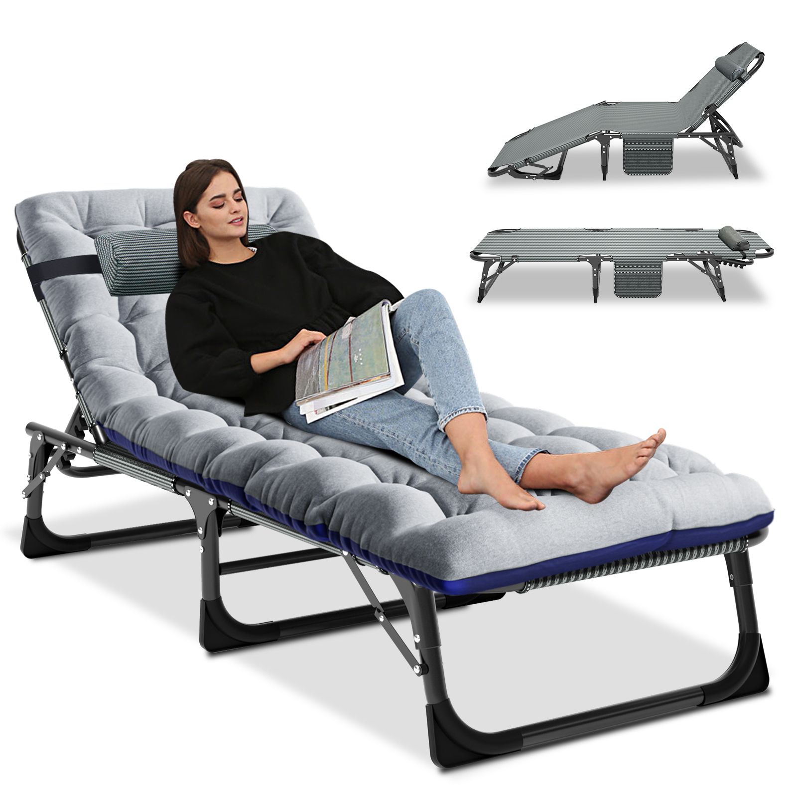 MOPHOTO Camping Cot With Mattress, Heavy Duty Sleeping Cot with Pillow, Cot Beds for Adult, 4-Position Adjustment Folding Bed, Outdoor Beds Lounger for Home, Pool, Beach, Patio