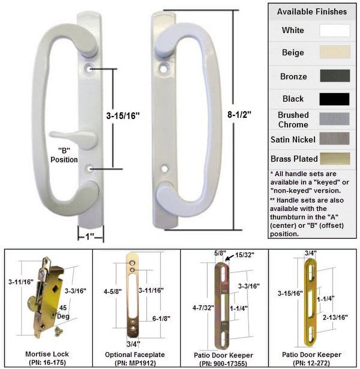 Sliding Glass Patio Door Handle Kit with Mortise Lock and Keepers, B-Position, Latch Lever is Off-Centered, White, Non-Keyed