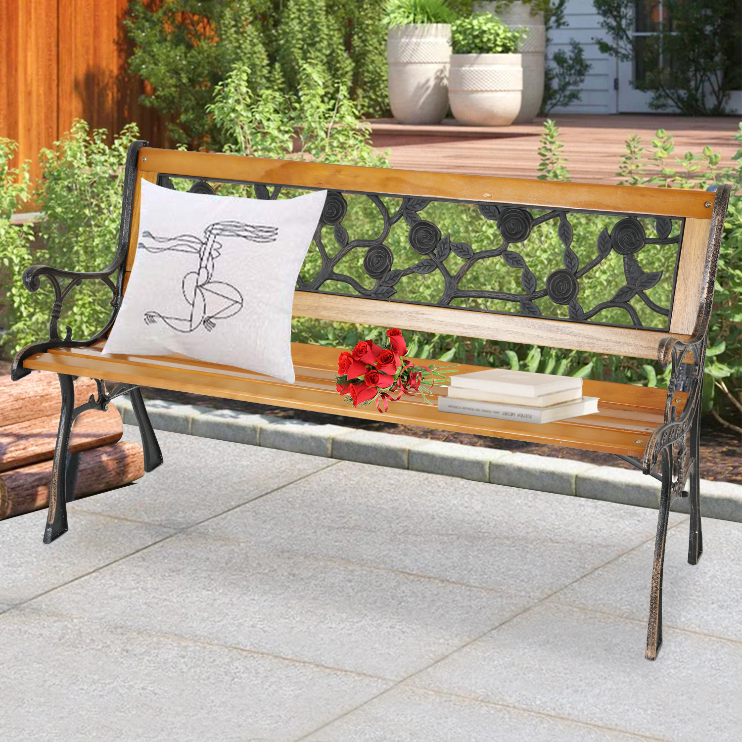 Outdoor Bench Garden Bench Patio Bench 50" Metal Park Bench Rose Cast Iron Hardwood Furniture for 2 Person for Park Yard Porch Patio Deck Lawn, Natural