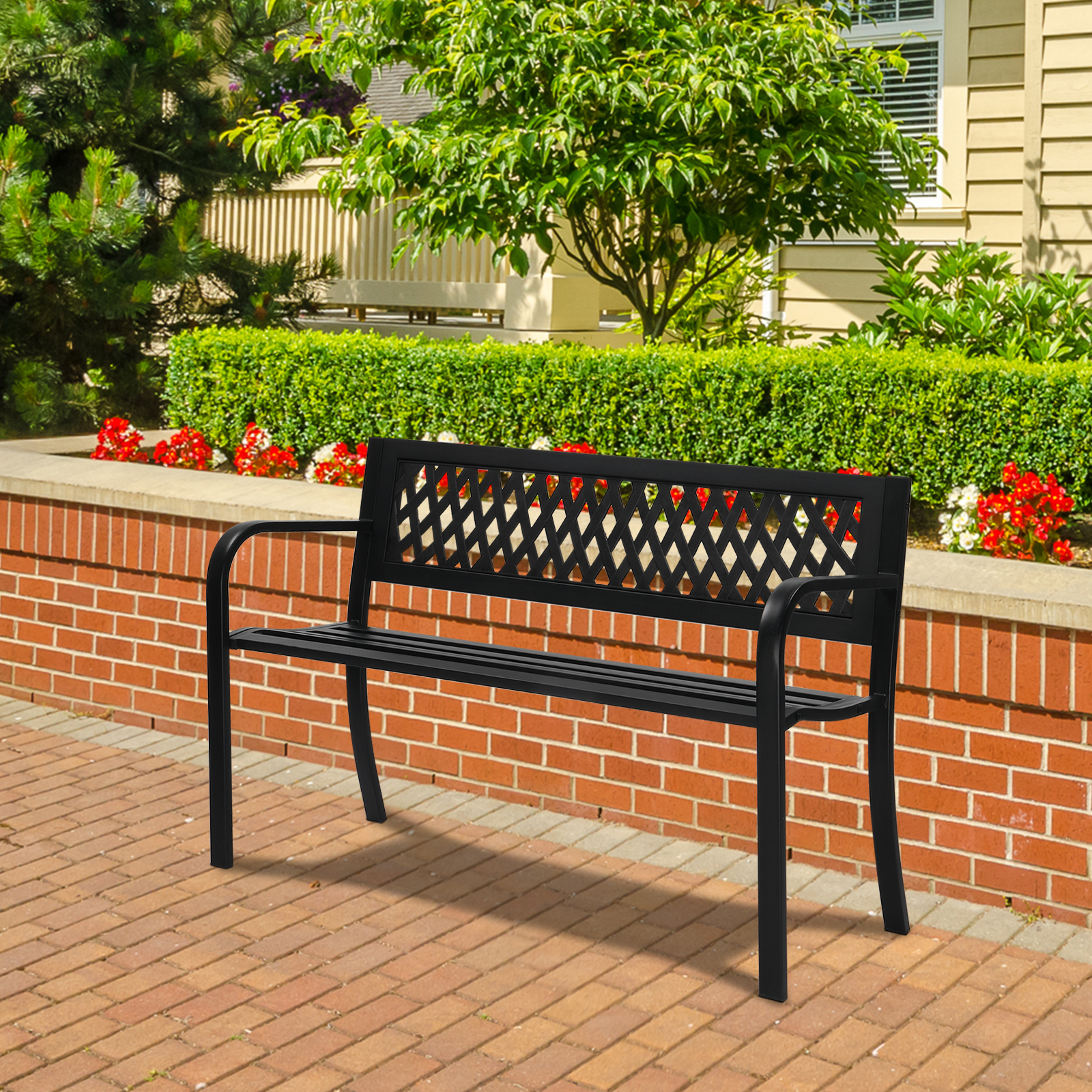 Costway Patio Garden Bench Steel Frame Park Yard Outdoor Furniture Porch Chair Black