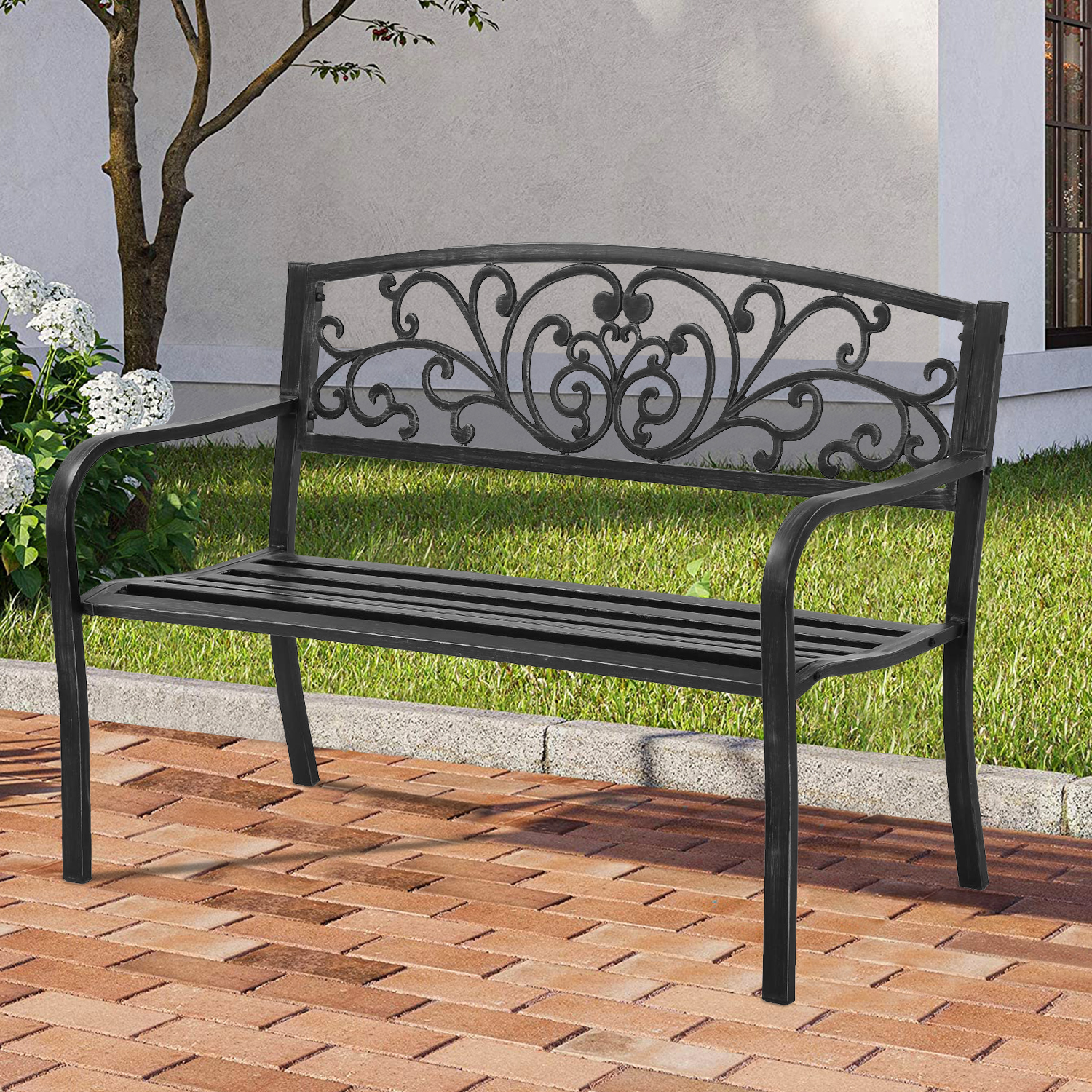 Outdoor Garden Bench Patio Bench with Back and Cast Iron Armrest, 50" Sturdy and Secure Steel Frame Patio Bench for 2 Person for Park Garden Porch Yard , Black