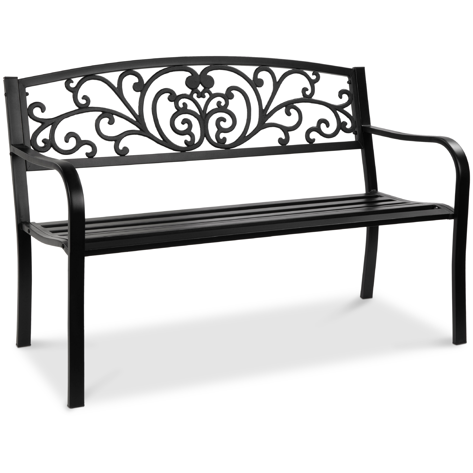 Best Choice Products Outdoor Steel Bench Garden Patio Porch Furniture w/ Floral Design Backrest, Slatted Seat - Black