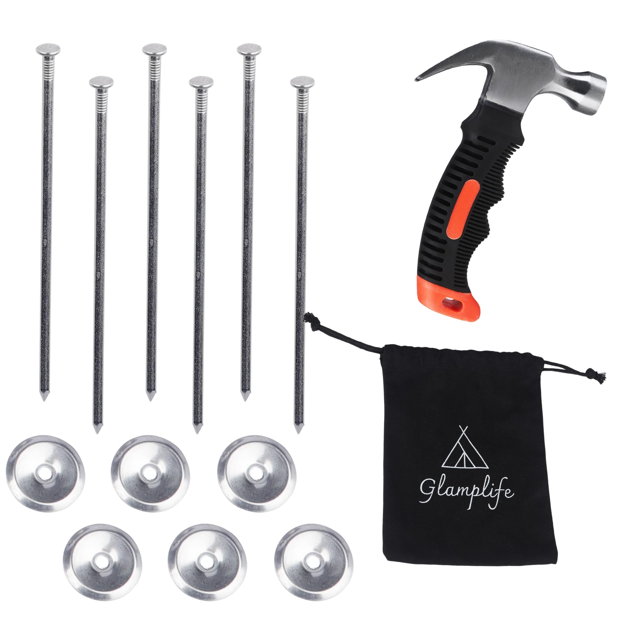 Camping Stakes - Patio Rug Stakes - RV mat Set for Camping with red Orange Stubby Hammer - Set of six Stakes with Bag Included - Metal Stakes with spacers - Heavy Duty Stakes