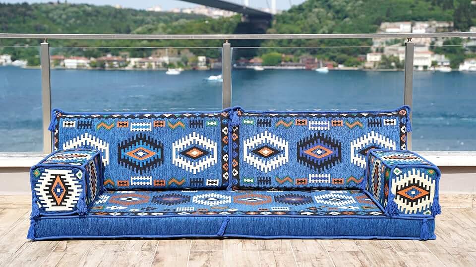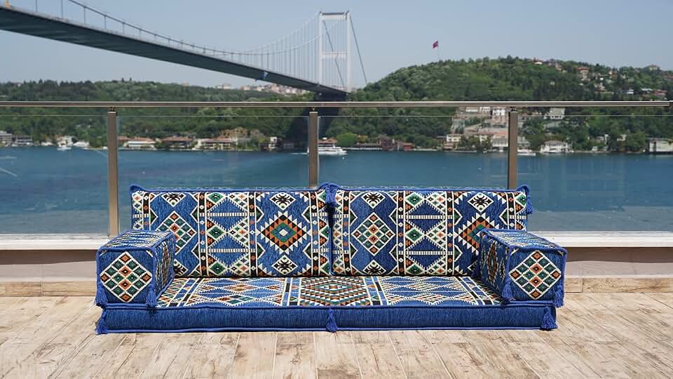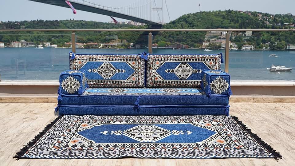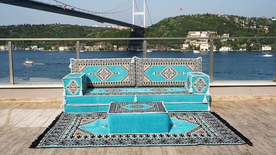 Turquoise Turkish Floor Sofas, 8" Thickness Floor Couch, Reading Sofa Pillow, Window Seat, Bench cushion, Meditation Yoga Loveseat, Healing Room Floor Cushion, Sofa Covers (Sofa + Rug + Ottoman)