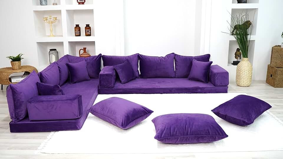 Velvet Purple Color Luxury Arabic Sofa Set, Velvet Floor Couch, Loveseat, Sectional Sofa, Pallet Sofa, Moroccan Home Decor Livingroom Sofa (L Sofa + Pillows)