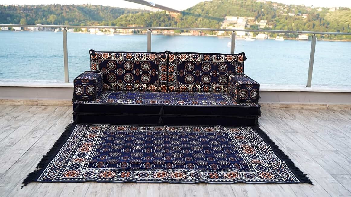Navy Blue Moroccan Living Room Couch, Arabic Majlis Furniture, Patio Furniture, Handmade Wooden Bench, Arabic Majlis, Outdoor Bench, Outdoor Furniture, Sofa Covers (Sofa + Rug)