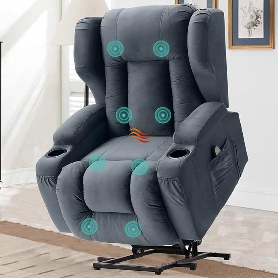 Velvet Electric Reclining Ergonomic Lounge Sofa Lift Chair with Massage and Heated, Electric Power Lift Recliner Chairs for Elderly with 2 Side Pockets, Cup Holders, Remote Control