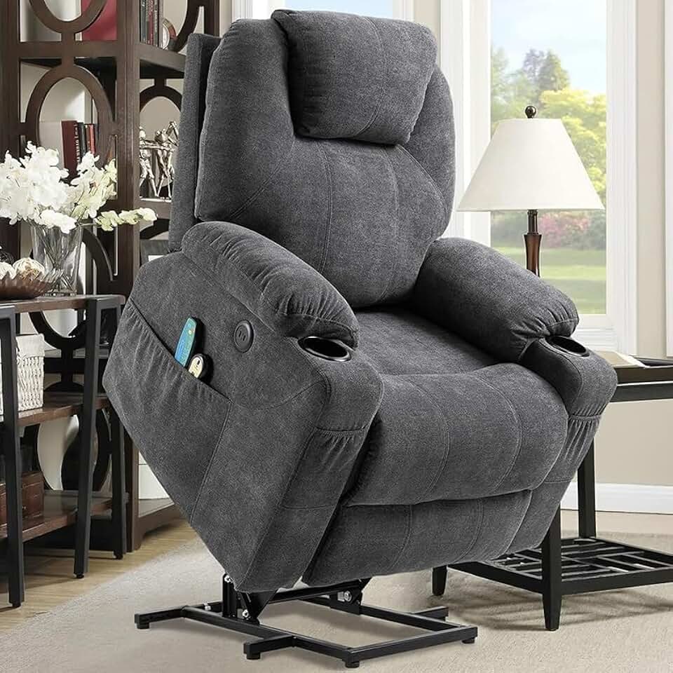 Ergonomic Electric Lift Recliner Chair for Elderly, Modern Massage Heated Recliner Chairs Sofa, Bedroom Office Fabric Lift Chair with 2 Side Pockets, Cup Holders, Remote Control for Living Room