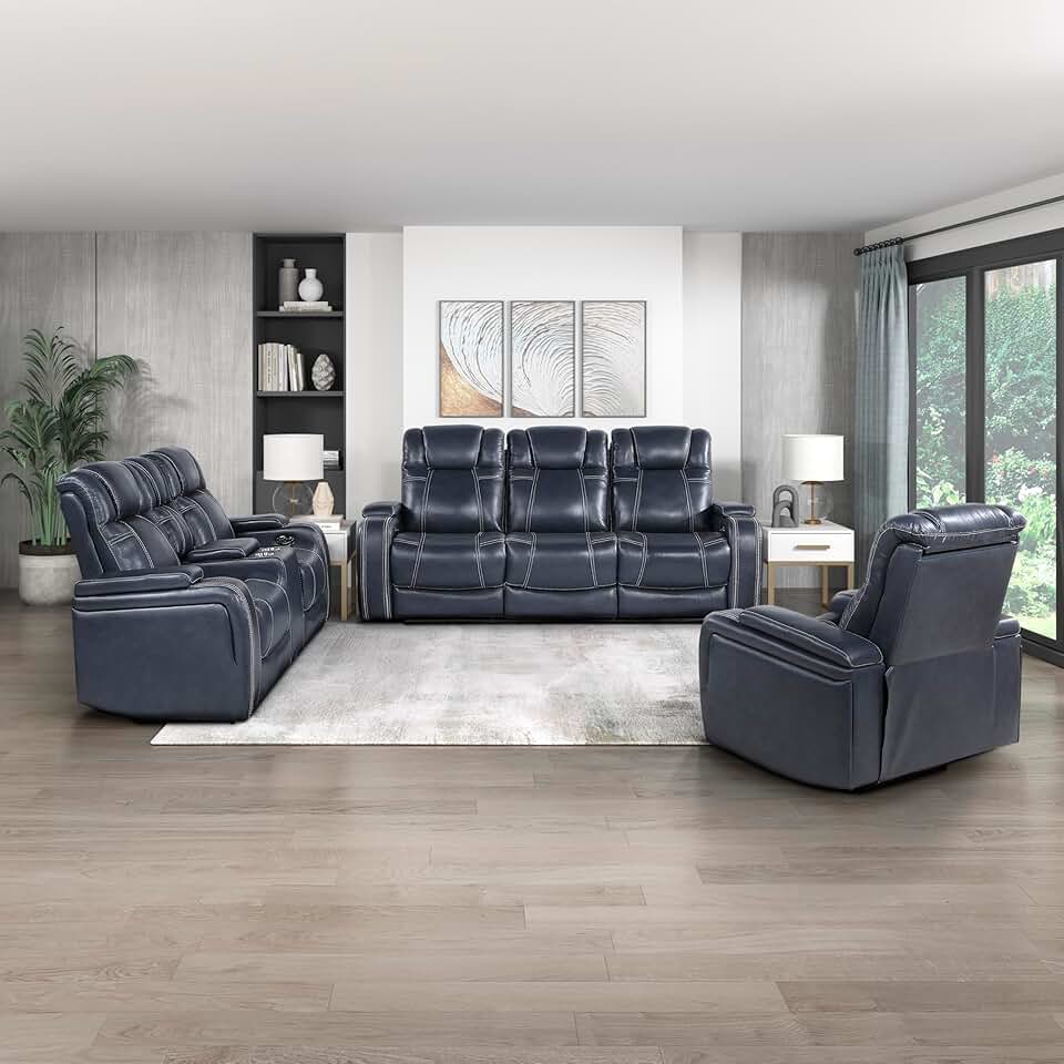 Lexicon Leather Recliner Sofa, Leather Recliner Loveseat and Leather Recliner Chair Living Room Furniture Sets, Power Wall Hugger Recliner Home Theater Seating, Double Recliner RV Couch, Blue