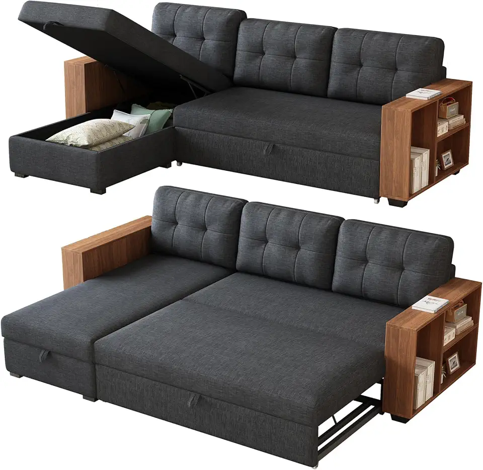 HHOK L-Shape Pull Out Sectional Sleeper Sofa Bed Living Room Furniture Sets with Storage Chaise, Convertible Comfy Couch Loveseat Upholstered for Apartment, Office - Dark Grey-Wooden handrail Sofá