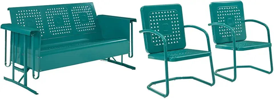 Crosley Furniture CO1023-TU Bates Retro Metal Outdoor Sofa Glider, Turquoise Gloss & CO1025-TU Bates 2-Piece Retro Metal Outdoor Arm Chair Set, Turquoise Gloss