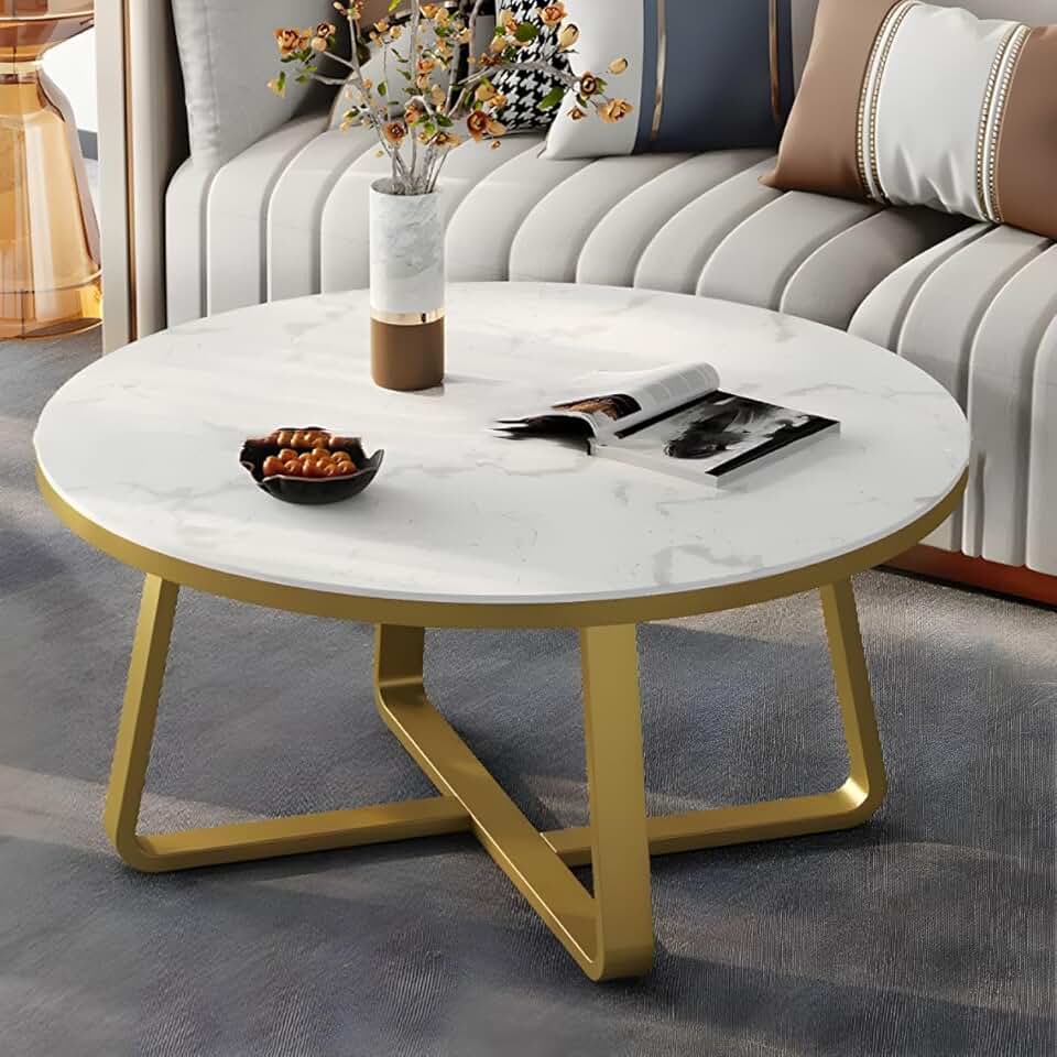 Coffee Table, Round Stone Modern Sofa Table with Scratch-Resistant Top & Steel Frame for Living Room Center