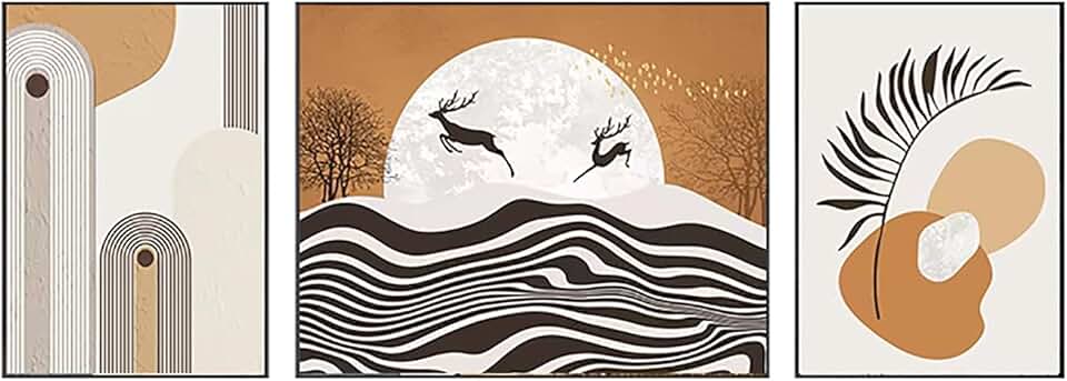 Modern Simple Decorative Painting, Foo Deer Triptych Combination Home Decor, Sofa Background Wall Hanging, Abstract Orange Line Mural for Living Room, Bedroom(14 * 20in/28 * 20in)