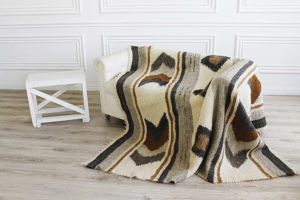 Moroccan beige Wool Throw Blanket, Plaid for living room, sofa bedspread, Thick weighted Cover Pattern Geometric Plaid, Heavy Bed Coverlet, Handmade Kilim fluffy cover, Aztec modern flokati wool