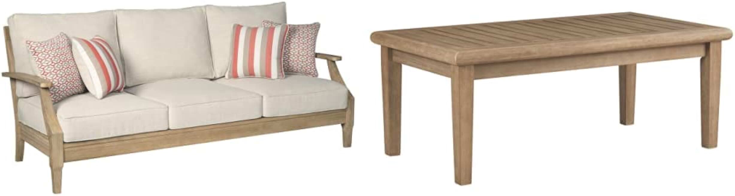 Signature Design by Ashley Clare View Coastal Outdoor Patio Eucalyptus Sofa with Cushions, Beige & Gerianne Outdoor Eucalyptus Patio Coffee Table, Light Brown