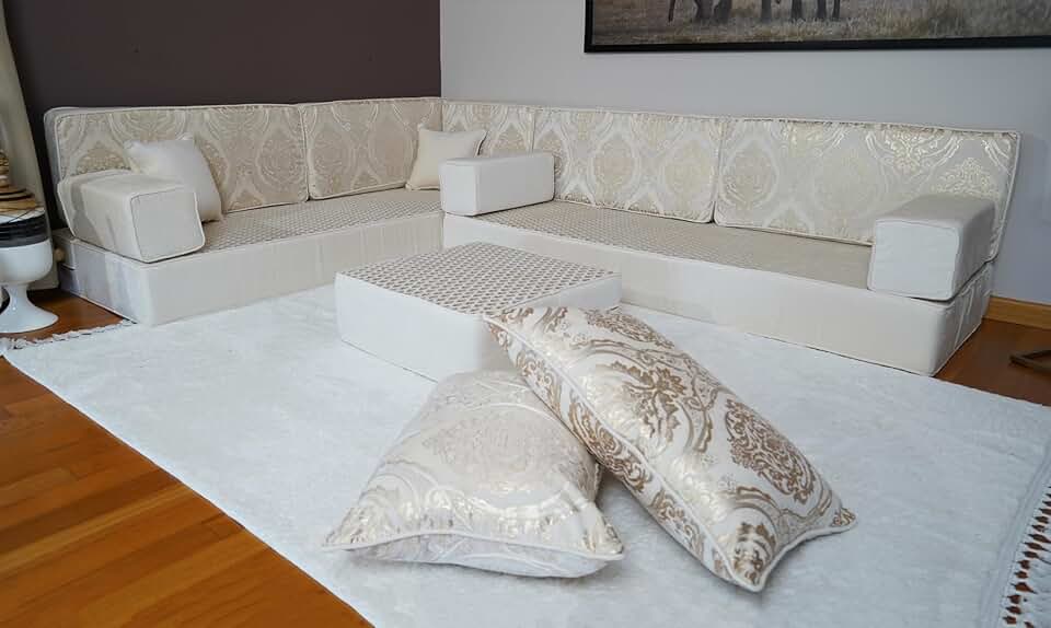 Arabic Floor Cushion, Bench Cushion, Turkish Floor Sofa, Arabic Majlis, Sofa Set Living Room, Diwan Sofa, Arabic Couch, Floor Pillow (8'' Thickness Sofa, L Sofa + Ottoman + Pillows, Royal White)