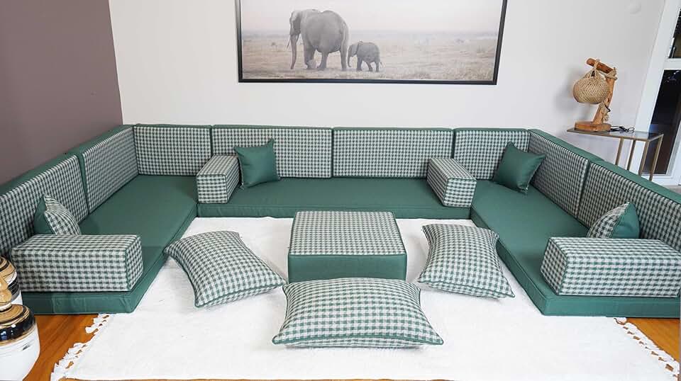 Arabic Floor Cushion, Majlis Sofa, Bench Cushion, Moroccan Sofa Set, Turkish Floor Sofa, Floor Seating, Sofa Set Living Room, Diwan Sofa (4'' Thickness Sofa, U Sofa + Ottoman + Pillows, Green)