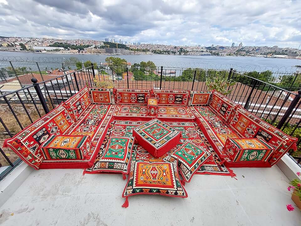 Colorful L Shaped Floor Couch, Interior Design, Outdoor Patio Furniture, Floor Cushions, Bench Cushions, Floor Pillows, Arabic Majlis, Pouf Sofa, Turkish Rug (L Sofa Full Set)