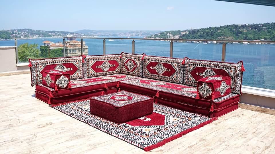 L Shaped Arabic Floor Cushions, Sectional Sofas, Arabic Majlis Set, Custom Made Sofa, Arabic Sofa Set, Seating Cushions (8'' Thickness Sofa, L Sofa + Rug + Ottoman, Burgundy)