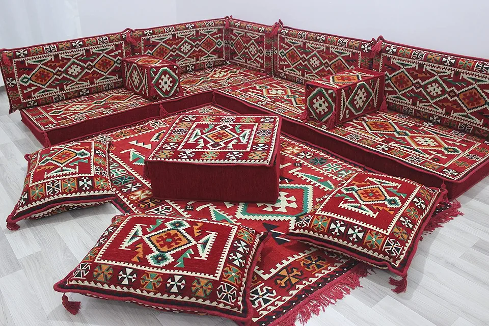 Loveseats, Sectional Sofa, Arabic Sofa Floor Seating Set, Pallet Sofa, Floor Cushions, Turkish Floor Sofa, Arabic Majlis, Kilim Rug Design (Red)