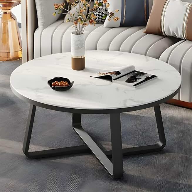 Coffee Table, Round Stone Modern Sofa Table with Scratch-Resistant Top & Steel Frame for Living Room Center, White Black