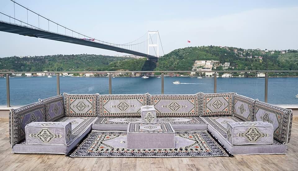 Gray Corner Sofa Seating Set, U Shaped Arabic Sofa Set, Oriental Floor Seating, Living Room Sofa, Sofa Slipcovers, Patio Sofa, Modular Sectional Sofa (U Sofa + Rug + Ottoman)