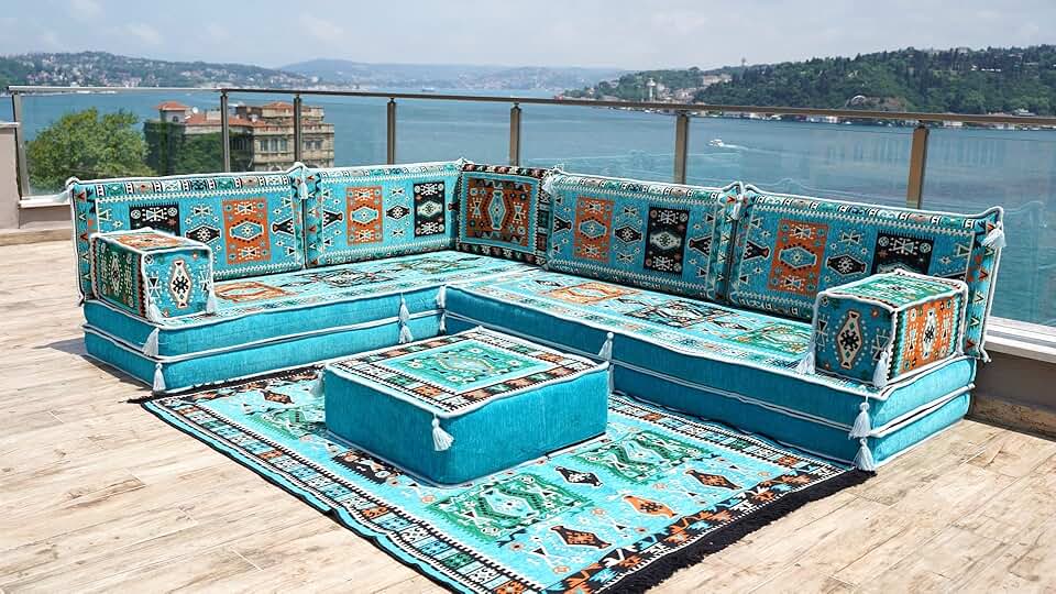 8" Thickness Turquoise L Shaped Floor Couch, Moroccan Livingroom Cushions, Corner Floor Cushions, Sectional Sofa Set, Floor Pillows, Arabic Majlis (L Sofa Full Set)