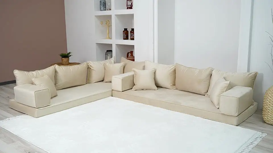 Beige Color Velvet Corner Floor Seating, Velvet Foor Couch, Arabic Floor Sofas, Moroccan Home Decor Livingroom Sofa, Moroccan Sofas, Luxury Velvet Furniture (L Sofa Only)