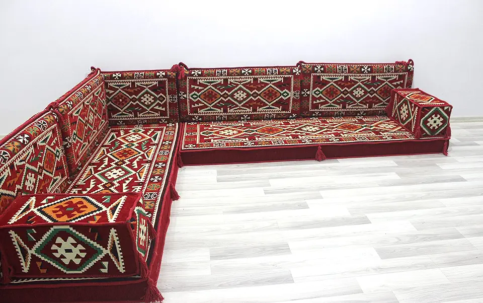 Premium L Shaped Corner Sofa Set, Floor Cushions, Bohemian Couch Set, Ethnic Pillow Set, Turkish Rug Jalsa, Bench Cushions (L Sofa + Ottoman + Pillows)