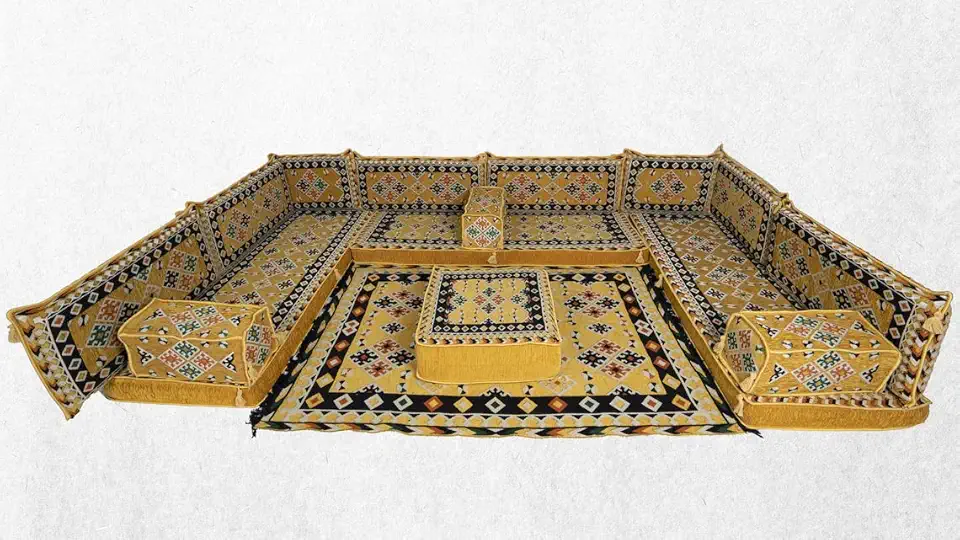 Yellow Arabic Majlis, U Shaped Arabic Sofa Set, Floor Pillows, Corner Floor Sofa Seating, Floor Cushions, Oriental Floor Seating, Arabic Jalsa, Slipcover Floor Seat (U Sofa + Rug + Ottoman)