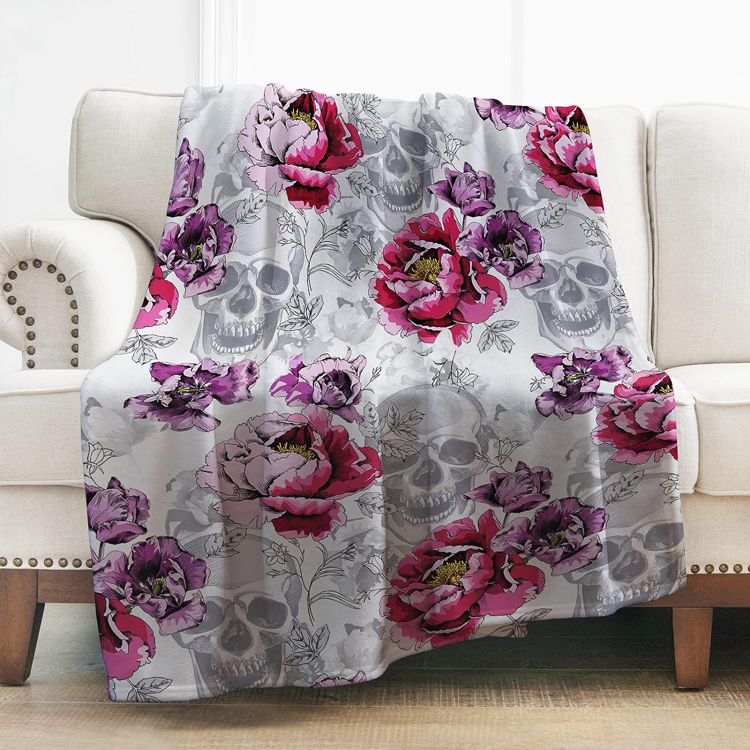JOOCAR Skull Flower Blanket Gifts for Women Girls Men Decor for Home Bedroom Living Room Sofa Car Crib Halloween, Soft Cozy Smooth Lightweight Throw Plush Blankets White 50"x60"