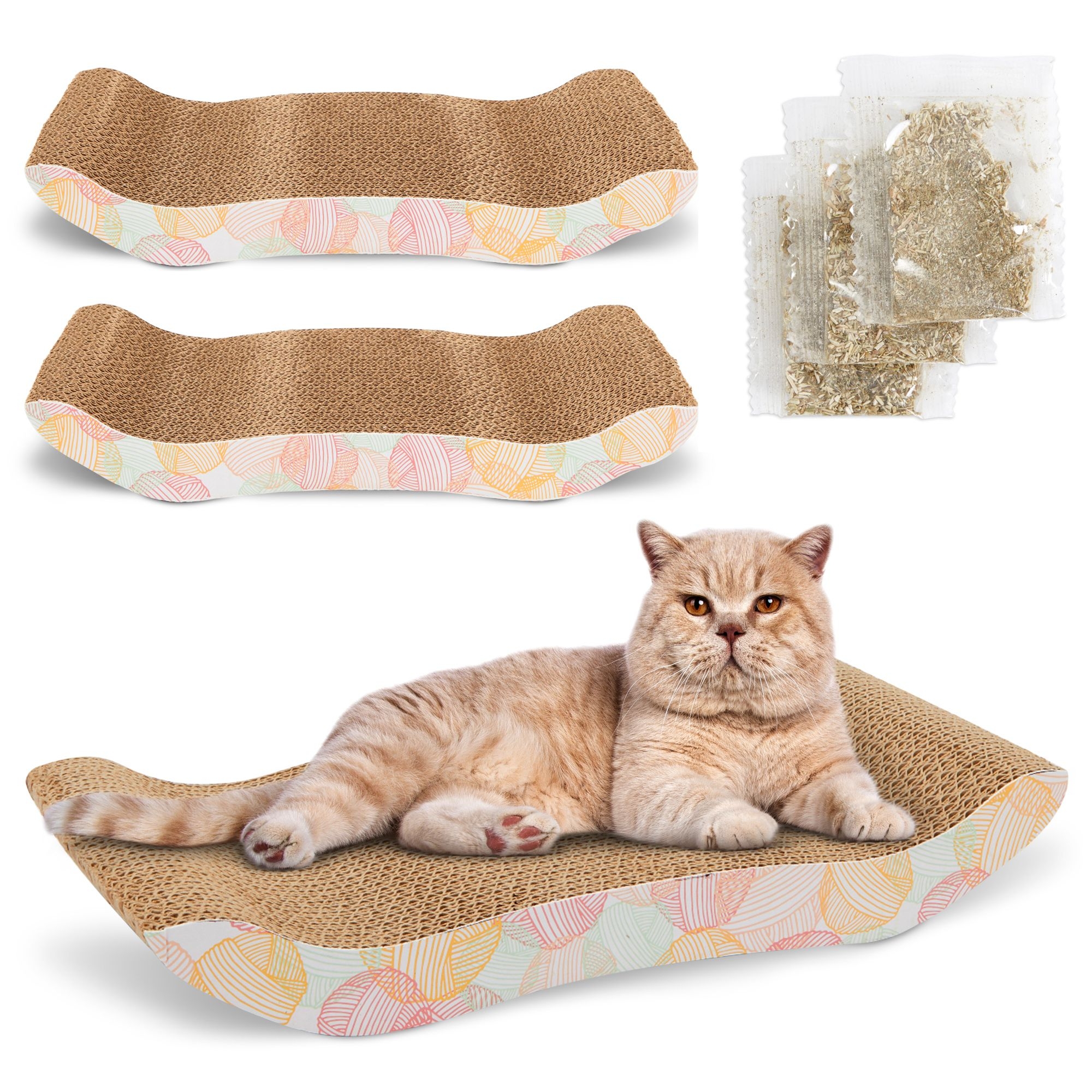 3-Pack Cat Scratcher Bed for Furniture Protection, Training, Indoor Kittens, Reversible Corrugated Cardboard, Modern Sofa Scratching Pad with 3 Catnip Bags (16x8x2.5 In)