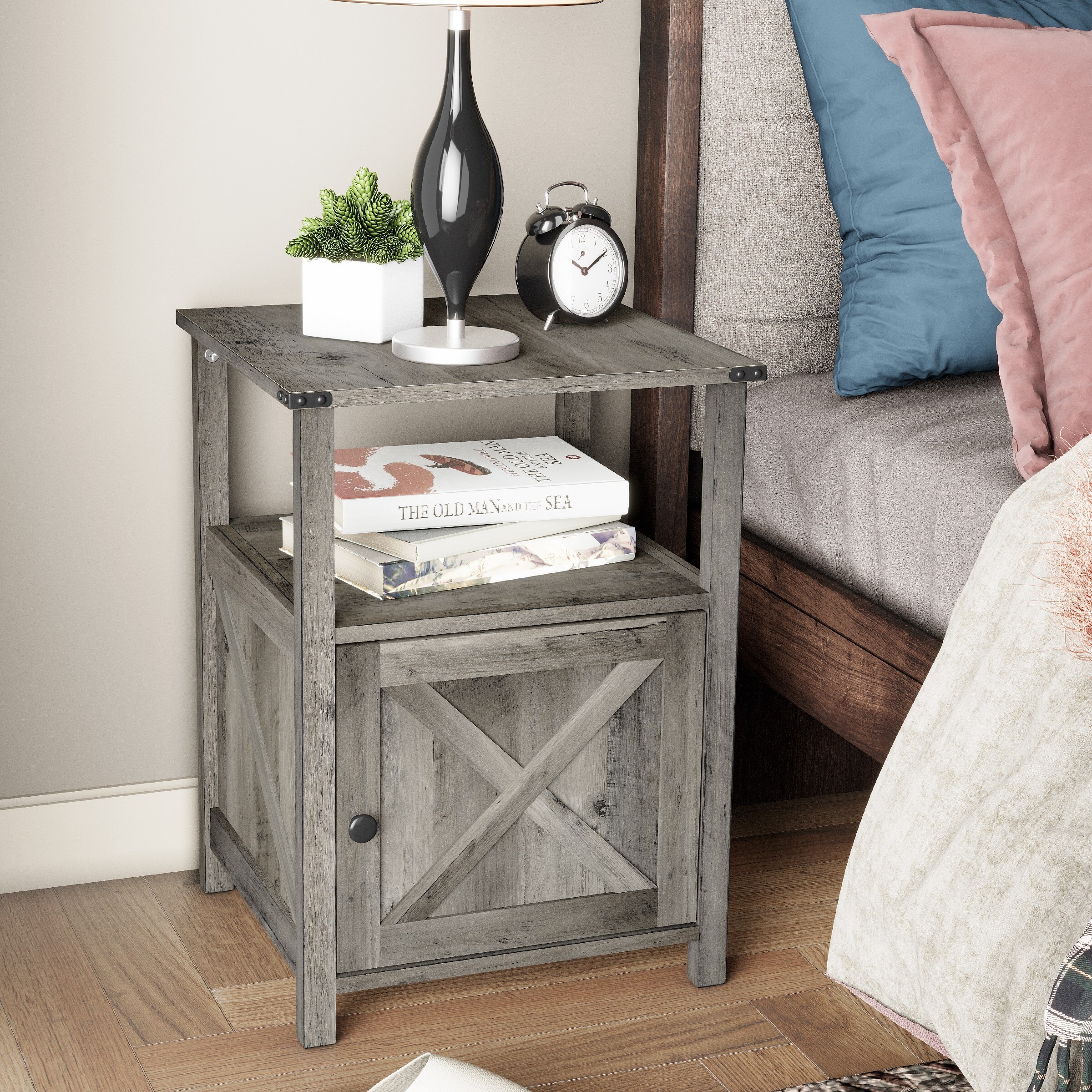 Pellebant Nightstand Sofa Side Table End Table with Storage Shelf and Cabinet - 17.52 in W x 16.73 in D x 24.01 in H Oak