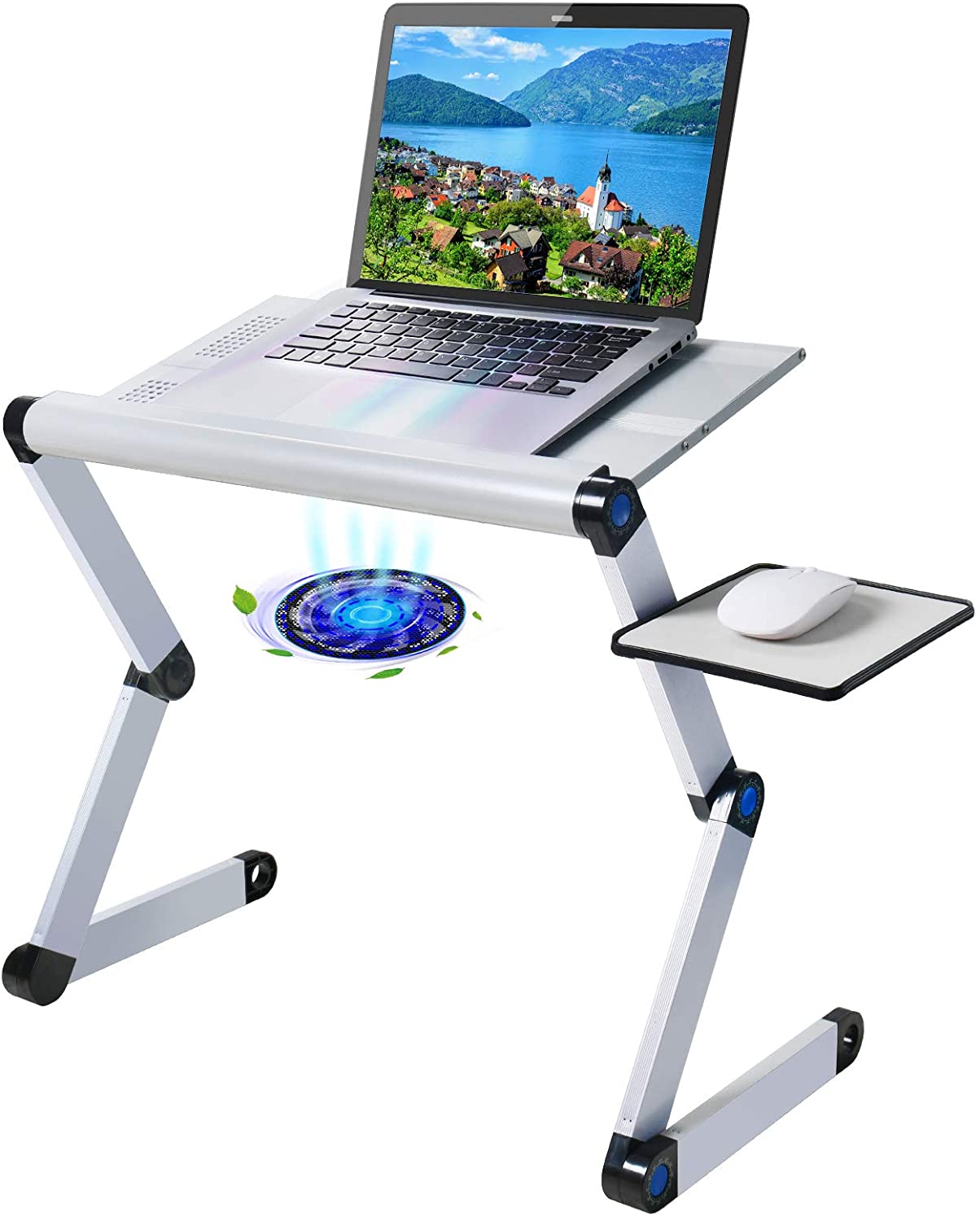 Upgraded Aluminum Laptop Stand Adjustable with Cooling Fan and Mouse Pad, Reinforced Ergonomic Lap Desk Foldable Portable Computer Table for Bed Sofa Couch Office (Extra Wide Tray: 19", Silver)
