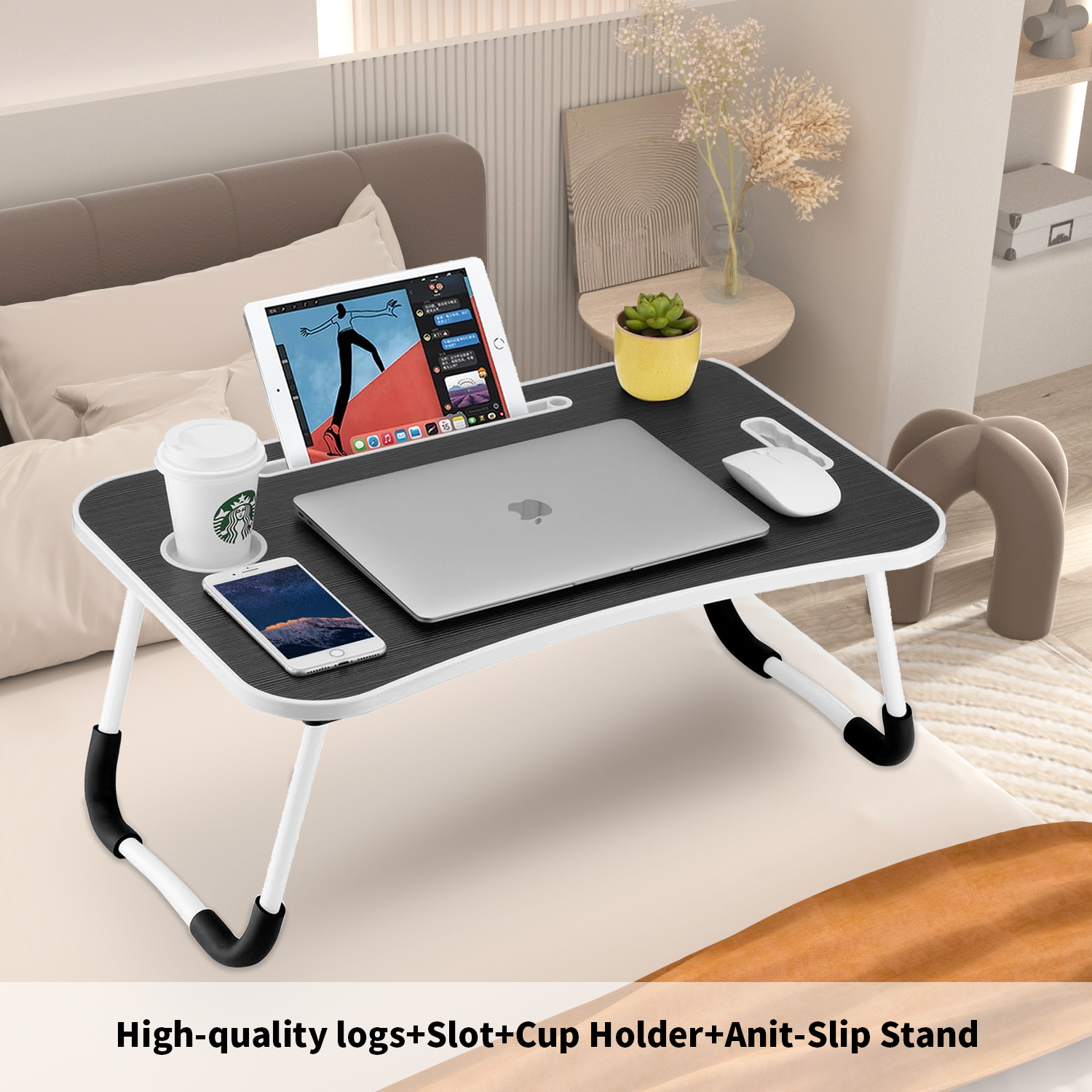 Livhil Portable Laptop Bed Table, Fordable Lap Desk with Cup Slot Notebook Stand Breakfast Bed Trays for Eating and Laptops Book Holder Lap Desk for Floor,Couch, Sofa, Bed, Terrace, Balcony (Black)