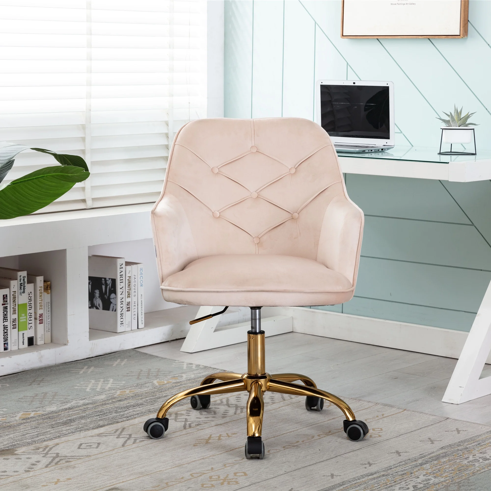 Modern Accent Chair, SYNGAR Velvet Fabric Vanity Chair, Upholstered Swivel Chair with Soft Back, Home Office Chair, Height Adjustable Side Sofa Chair for Bedroom Living Room, Beige, D2898