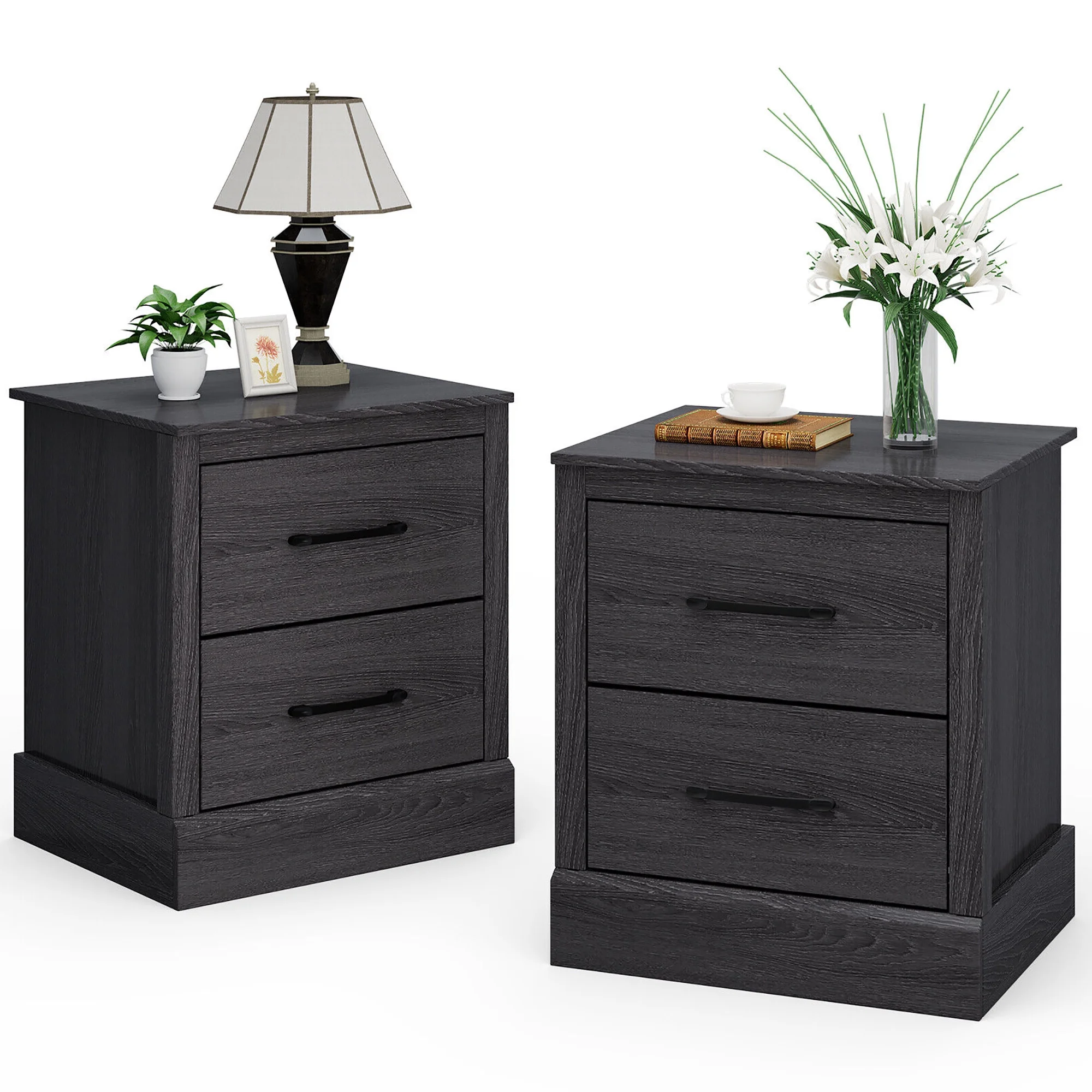 Gymax Set of 2 Drawer Nightstand Bedside Table Compact Sofa End Table Oak Dark Grey