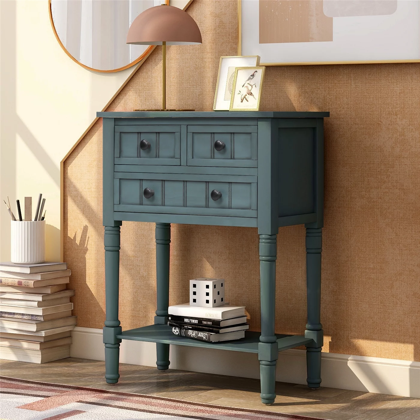Narrow Console Table, Solid Wood Slim Sofa Table with Three Storage Drawers and Open Bottom Shelf, Classic Multifunctional Storage Cabinet for Entryway Living Room, Easy Assembly, Navy
