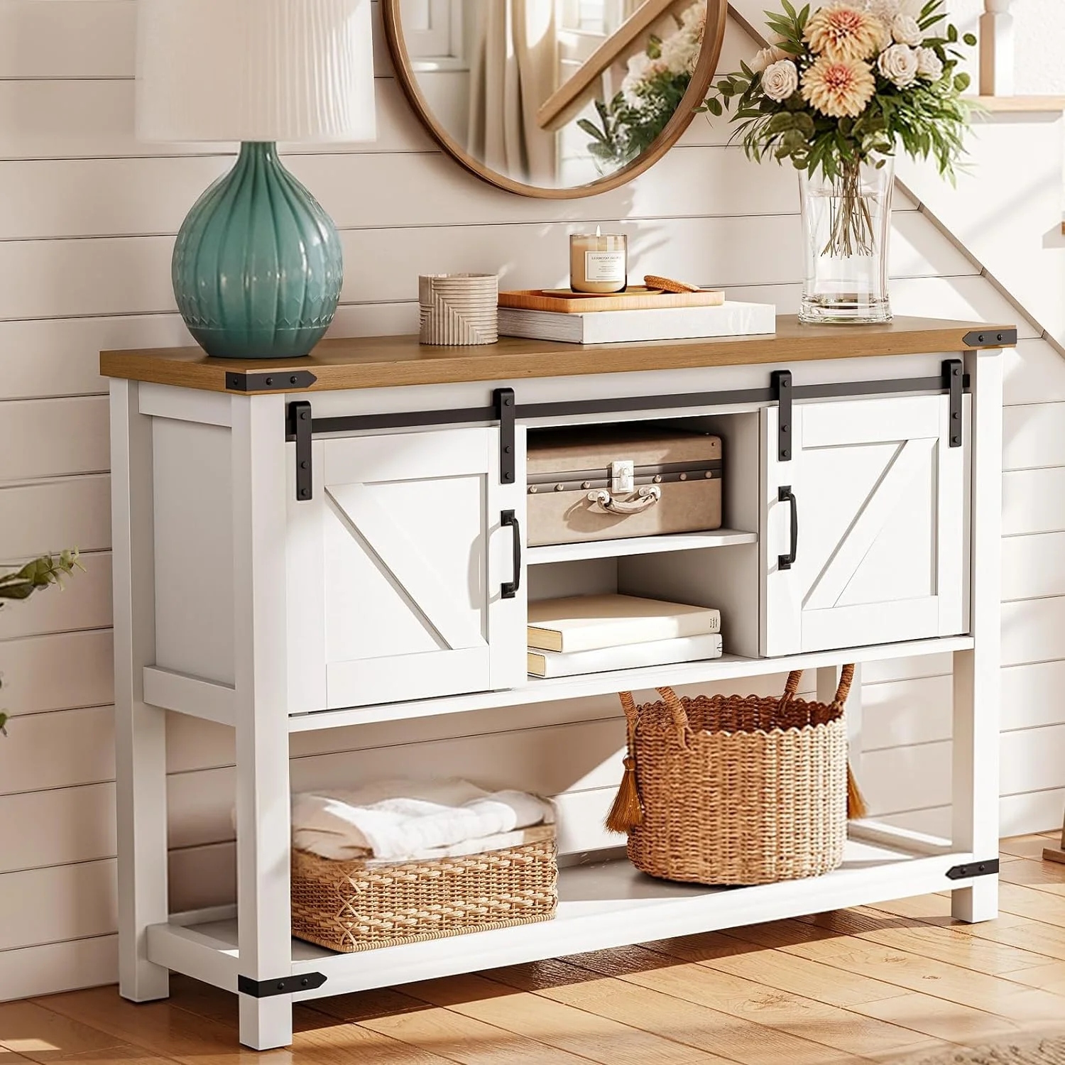 LARMNEE 46" Farmhouse Console Table Entryway Table with Open Shelves and 2 Cabinets Sofa Table with Sliding Barn Doors Kitchen Buffet Sideboard Hallway, Entrance Living Room White and Walnut WH17XG01